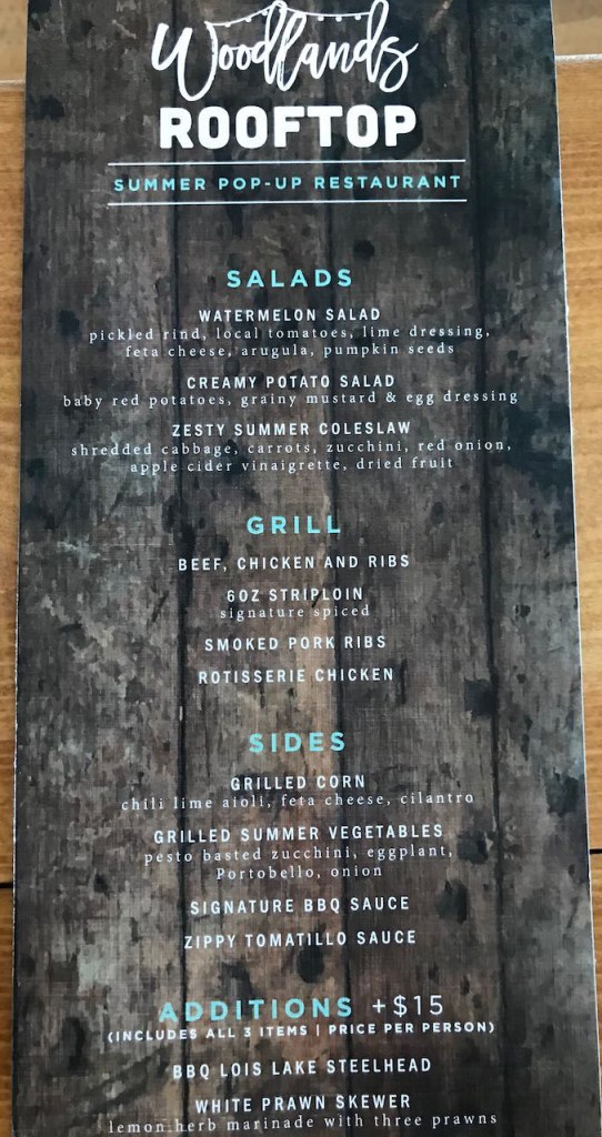 “Welcome to the Woodlands Rooftop, where family-style dining meets spectacular mountain experiences! This relaxed and welcoming covered rooftop restaurant features live music, refreshing drinks, a delicious local-inspired menu prepared by Executive Chef, Isabel Chung, and a picture-perfect mountain backdrop.“