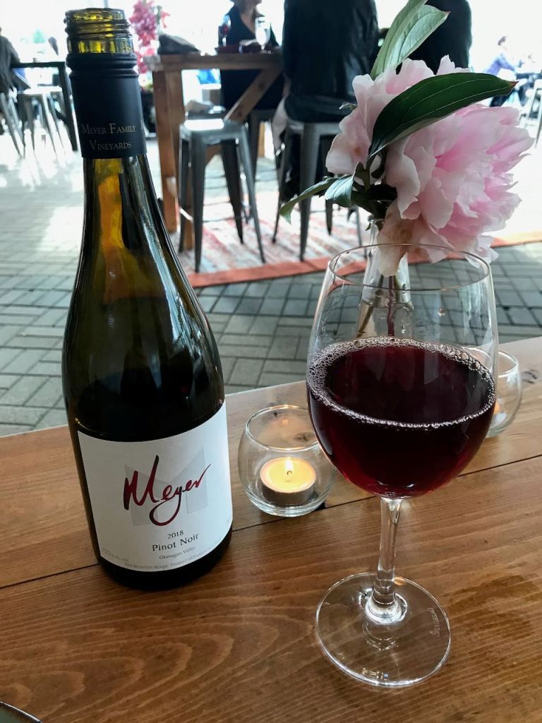 We aren’t big Smoked Pork Rib people so we ended up ordering a extra substitute of chicken instead of the Smoked Pork Ribs. There was also the option to add seafood in the form of steelhead salmon or prawns to the meal for an extra $15 CAD. We enjoyed a bottle of British Columbia Meyer Pinot Noir to go with the meal. The initial impression was that it was a little rough the initial attack and could have probably benefitted from a decanter. However, it paired excellently with the barbecue and we eventually really enjoyed it paired with food.