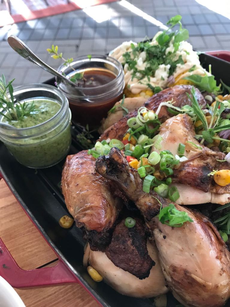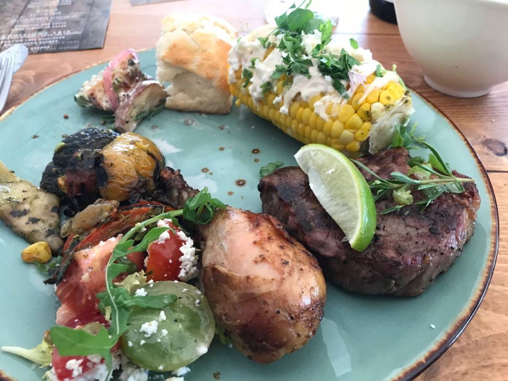 After the salads were mostly consumed when the main event arrived. Tonights main event was Beef 6 ounce Striploin with signature spice, Rotisserie Chicken. The sides included grilled corn on the cob, with chili lime aioli, feta cheese, cilantro, and grilled summer vegetables with pesto basted zucchini, eggplant, Portobello, onion. As if this wasn’t enough, there were also two side sauces to go with it, a signature bbq sauce and a zippy tomatillo sauce.