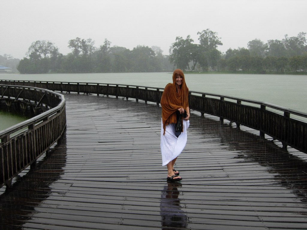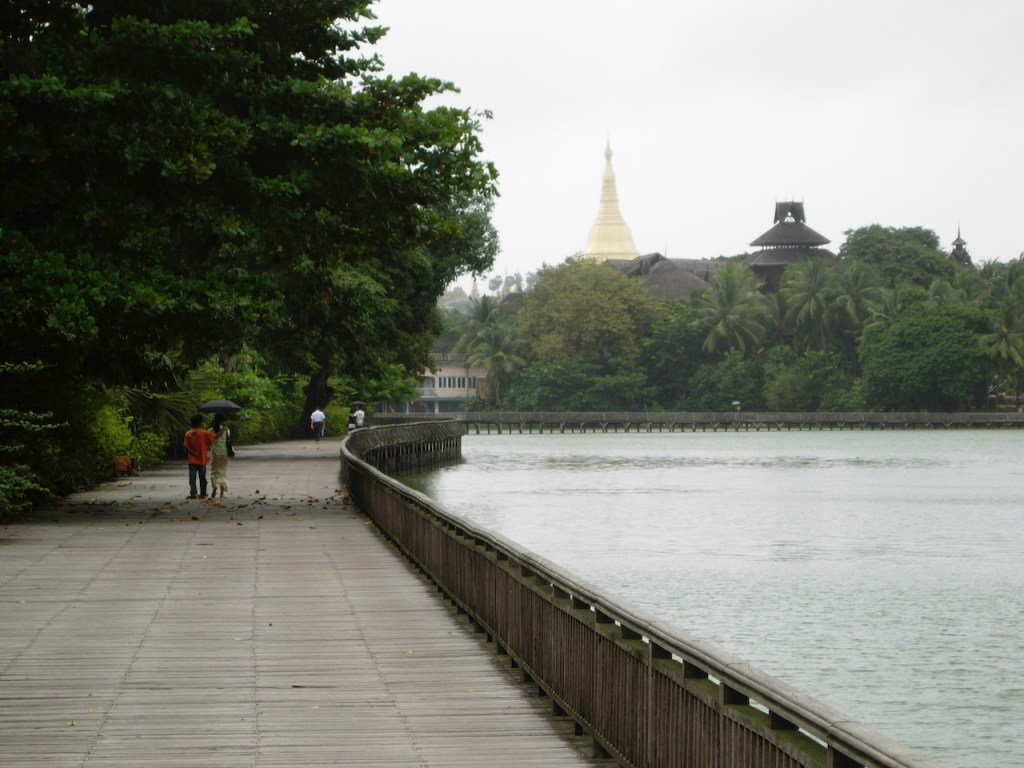 We further wandered down to the water area surrounding Kandawgyi Lake. It was a nice picturesque and grey area despite the clouds. The water walk way had Shewdagon Paya peeking through in the background. It was a pretty wet experience and we got throughly soaked halfway through our walk.