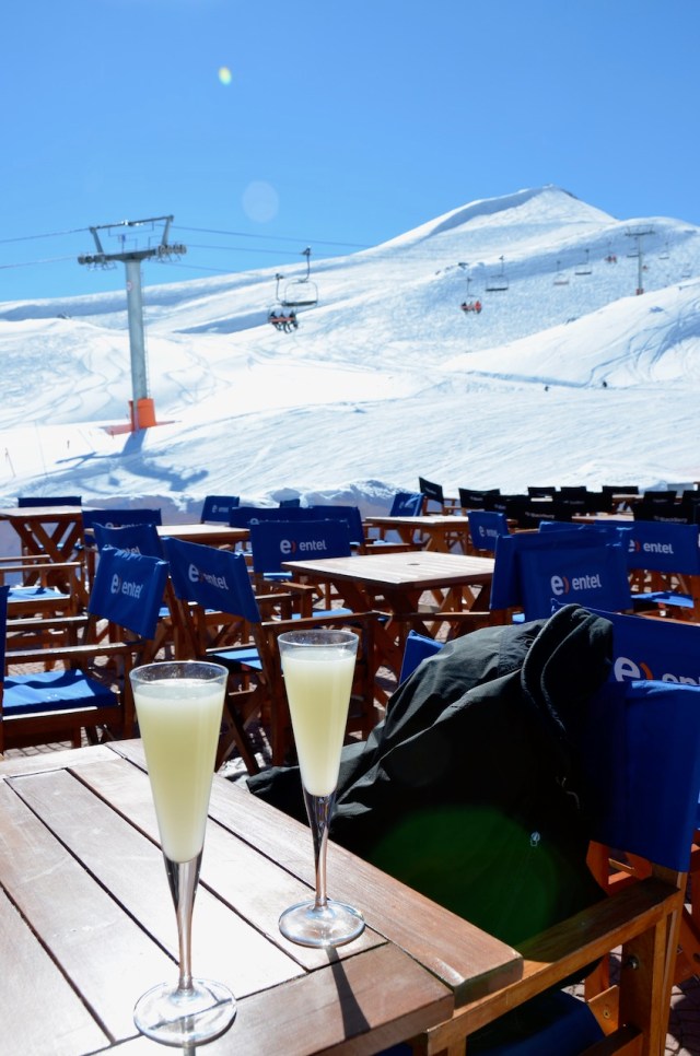 One of the best parts of skiing in Chile, South America is that Après Ski comes with Pisco Sours instead of the usual cerveza / beer. Pisco Sours during Apres with a view to die for
