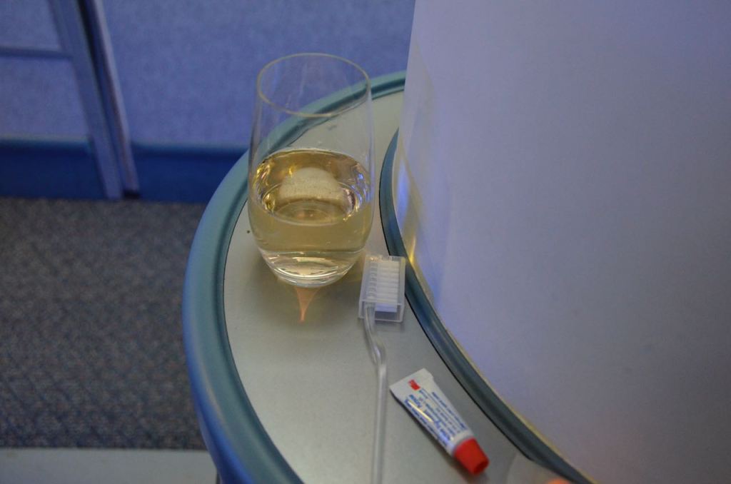 The pre-departure beverage was offered, along with the usual amenities. I was never so happy to see those cheap socks in this kit. Probably also a first for this blog to have a pre-departure beverage photo of champagne with a tube of toothpaste next to it.