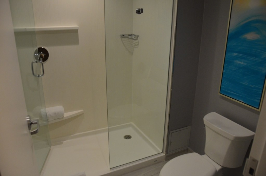 The bathroom was adequately sized. Surprisingly for a hotel, the bathroom had heated in laminate floor.