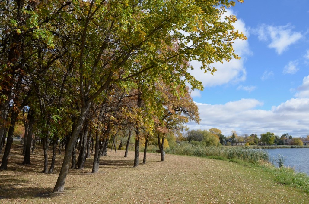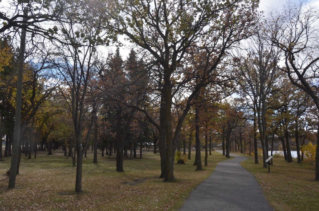 We went for a 3.6 mile walk around town today. We started off by leaving the house and heading down to Killarney Lake. Being that it was nearing fall, the colors of the leaves were starting to turn into greens, browns and oranges of autumn.