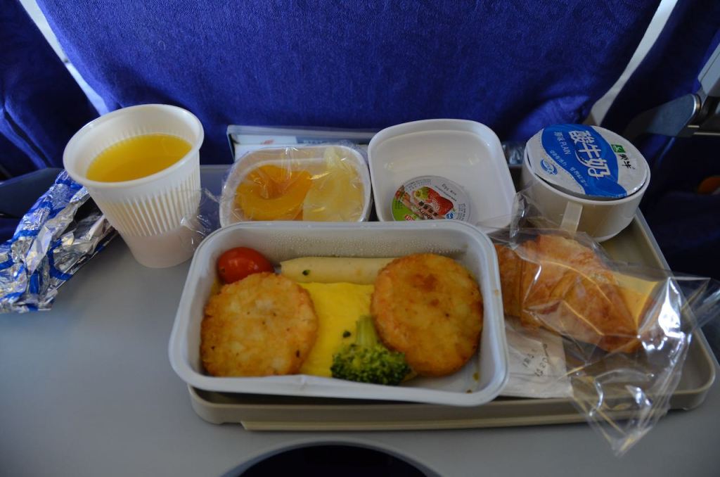 As we left early in the morning, a western breakfast or Asian breakfast was offered. The Western Entrée consisted of scrambled egg, chicken sausage, a stalk of broccoli and two small hashbrown potatoes – in the soft microwave variety. I was quite pleased to see this as I was in the mood for some food from home. I have a difficult time with the Asian breakfast. I did sneak a peak through the seats to see the asian breakfast and found out that it was plain looking congee and a brown egg. I’m a fan of trying new foods but even that would have been hard to stomach in the morning.