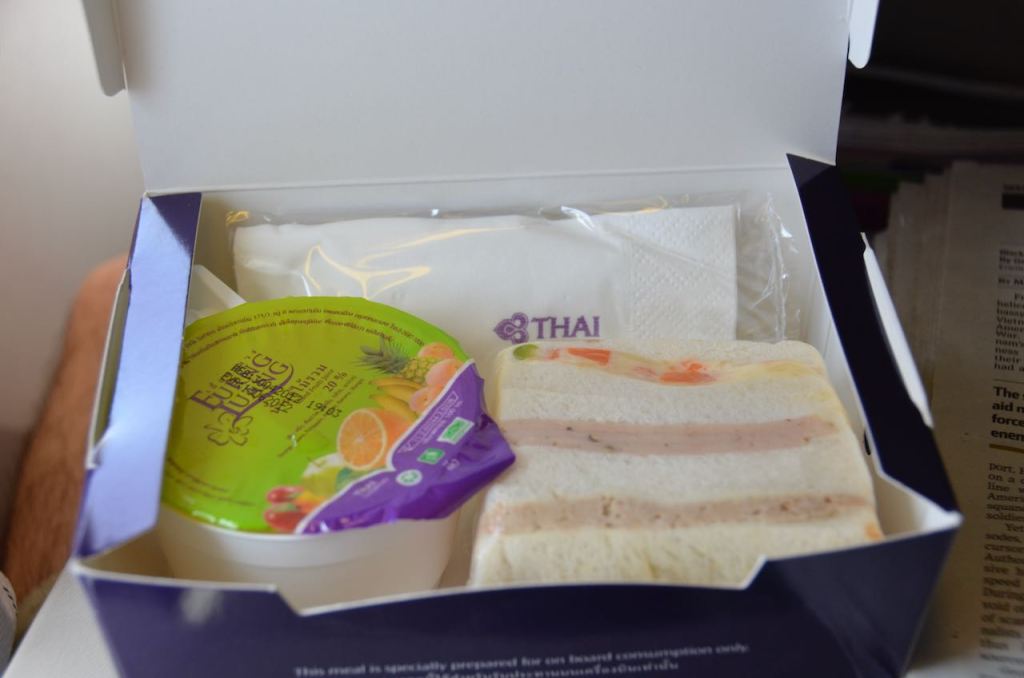 For just a one hour flight, we were still given a quick mini snack. It was a small sandwich with the crusts cut off consisting of a tuna filling, a ham filling and one that looked like egg, but was a strange liquid goo.