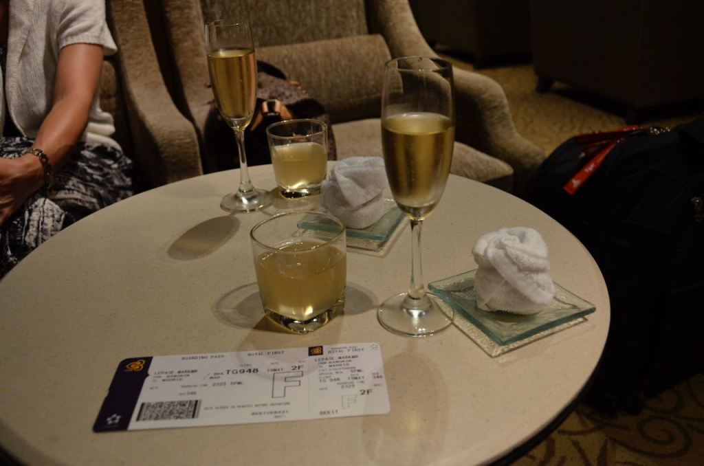 After our massages, I took a quick shower to scrub off the oil in the attached bathroom. I met my other half in the spa lounge holding area of 3 tables (Royal First Only) where we were offered the option of a drink, which was a classy touch indeed. We elected to return to the First Lounge with massive smiles on our faces and a new appreciation for Thai Airways. The ground service so far was like nothing that we had ever experienced.