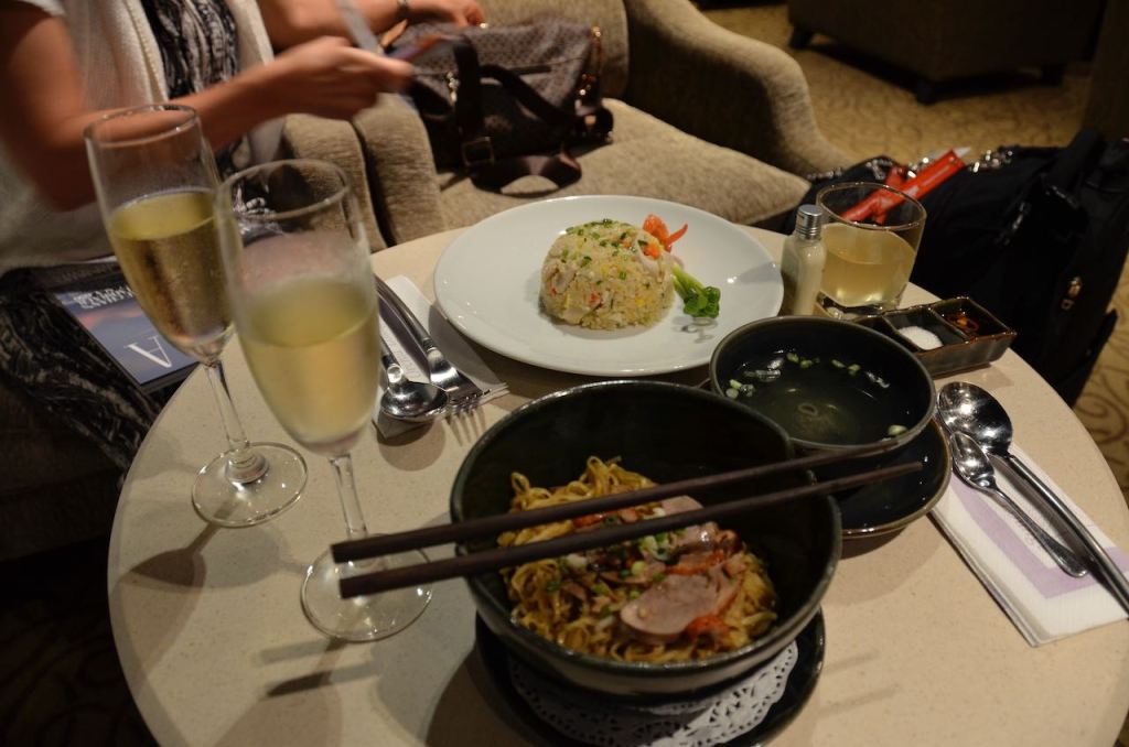We resettled in at the First Lounge. I took a look around, desperate to savor the experience. It was like that slow first dance that you had as a teenager in high school, crystal ball circulating with stars all over the walls, you never wanted it to end. Another two classes of Moet passed the time. This evening, the lounge was at near perfection- or at least everything in our world. Excited about what we had experienced, we started to play a game, Ms WT73: “See if you can reach the bar and order a drink.” With each attempt, like in rugby or football, we were “blocked” by exceptional wait staff who stopped us before we got there, and offered to bring over a glass of bubbly to our table. The drinks always arrived within 3 minutes or less, highlighting their efficiency here. I might add that the lounge was exceptionally busy too. . .