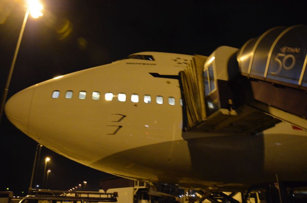 As the raindrops pattered down on the windshield, and the faint squawk of the Thai language echoed off of portable radios, we drove through the hive of activity of the ground level apron of Survarnabhumi. As we passed through baggage carts, catering runs and assorted equipment, we approached upon a retro livery Thai Boeing 747-400. The next chapter in our story was about to begin.