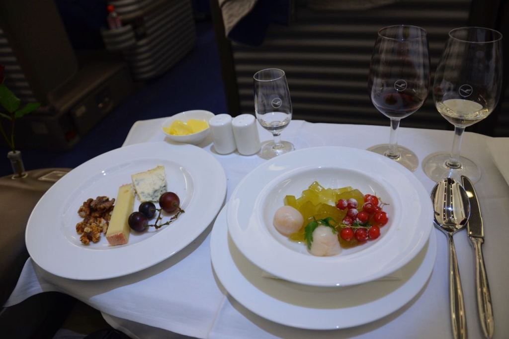 With the appetizer service, I opted for the etagiere. The appetizers included. The tabulleh with cheese was the best airline food serving I had over the course of this whole trip. The caviar was also enjoyable. I enjoyed a glass of white burgundy to go with this.
