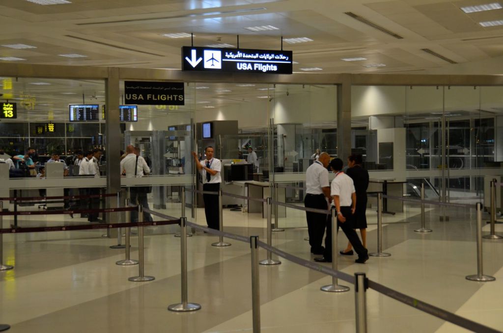 Secondary screening for the USA bound flights in their own separate areas, where our bags were torn apart with a polite thank you.
