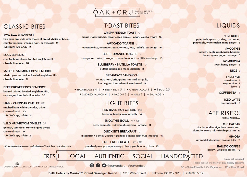 I arrived to Oak + Cru without a reservation and was seated promptly. It’s worth noting for points hounds that the restaurant is also on Open Table Reservations system, although it wasn’t at breakfast when I visited. The breakfast menu offers a few breakfast items, consistent with its stature as a hotel all day dining restaurant.