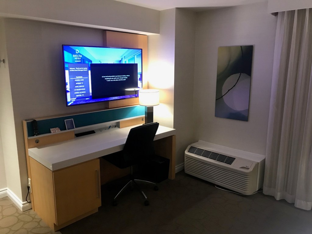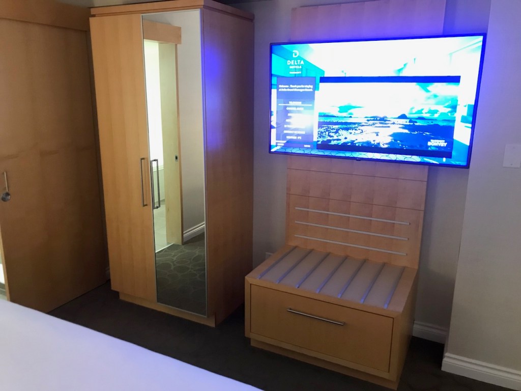 The desk offered a large counter space for working or dropping off your charging devices. It featured a full power bar, with USB ports, data ports and the old school internet Ethernet cable as well. For some reason, the welcome screen on the hotel television showed my room assigned to another persons name. Despite this, I didn’t get disturbed the entire time I was there due to any double room assignment issues.