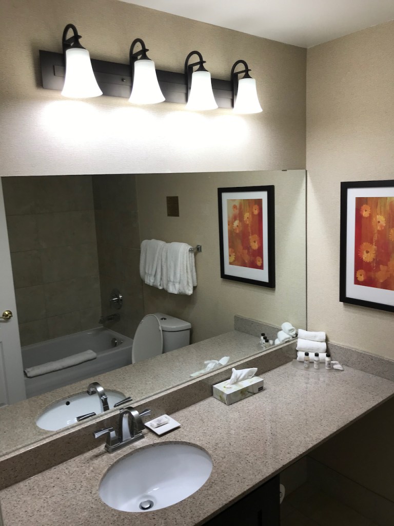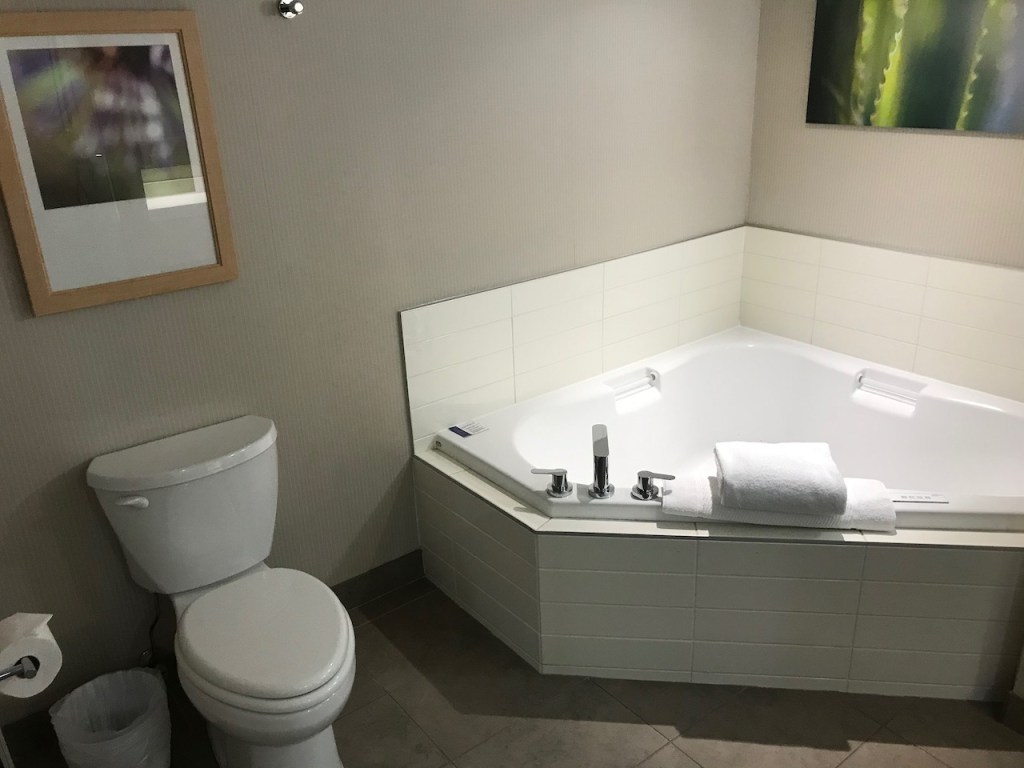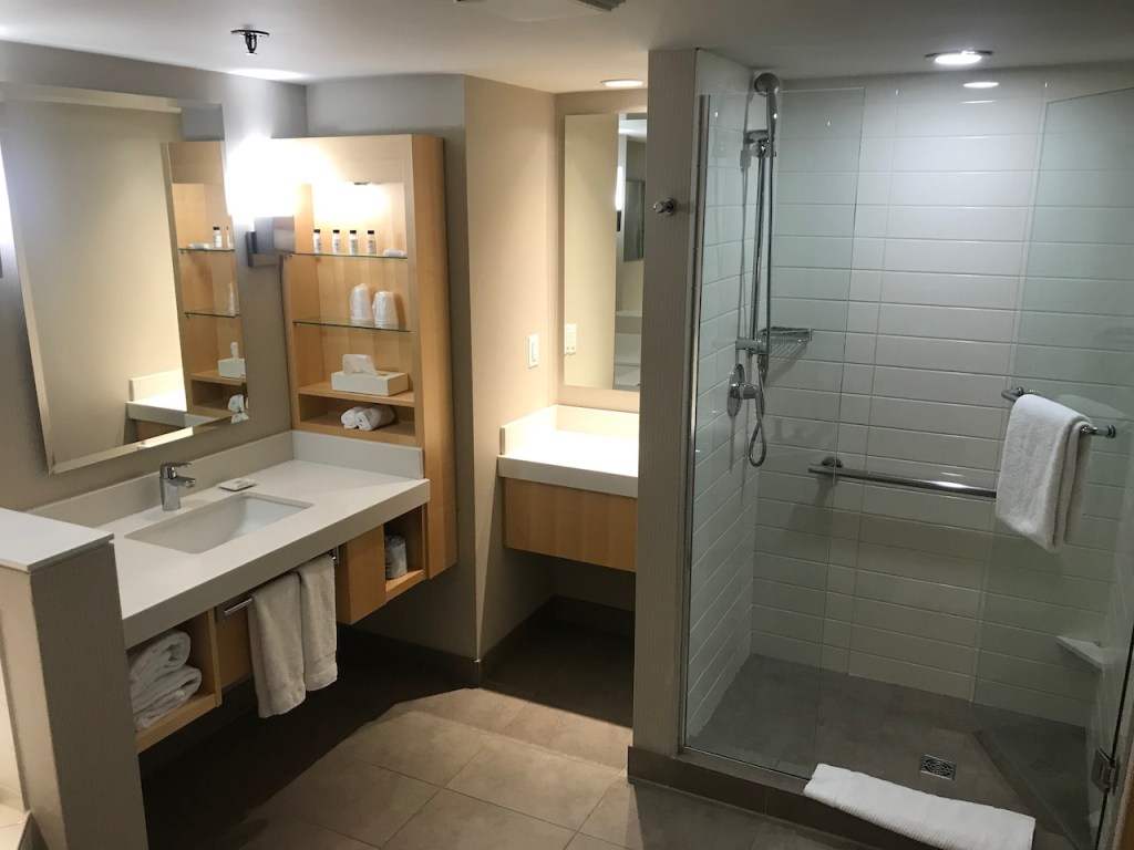 The bathroom was quite large for a regular hotel room. It featured a stand up shower and separate jetted tub. There was also a separate vanity counter with matching mirror. There was lots of room to run around in the bathroom.