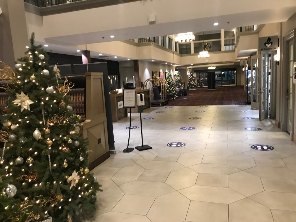 After walking over from the parking garage, I checked in at the main lobby. Despite it being quiet, the desk was manned and there was no wait to be checked in. I was warmly welcomed and thanked for being a Marriott Titanium member and was awarded an additional 1,000 Marriott Bonvoy points as a welcome amenity. For Marriott Platinum or Titanium members seeking breakfast, a $10 USD per person voucher is offered for those seeking the breakfast option. The breakfast option is takeaway hot / cold items at the Canteen as the property restaurant was closed for breakfast during my latest visits during the pandemic. I was also offered a bottle of water from reception, in lieu of water being placed in the room.