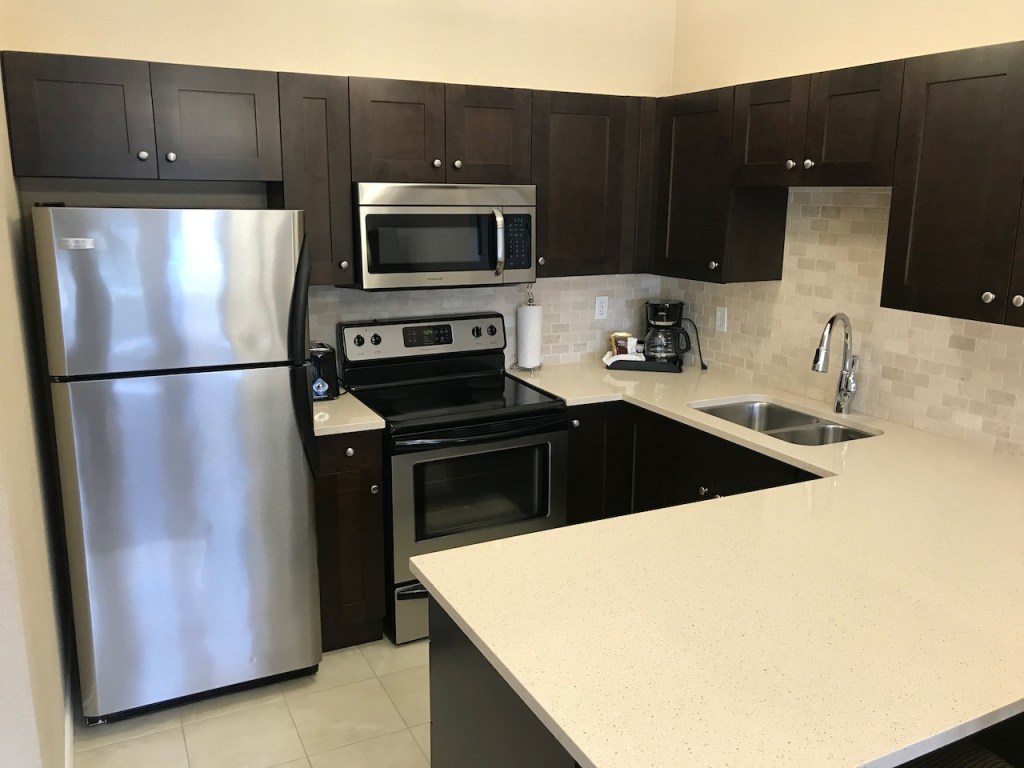 The room also offered a full kitchen. The kitchen contained a range, a microwave and a a fridge and freezer combination. Being on the top floor, the kitchen was underneath a vaulted ceiling which made the space feel large and spacious.