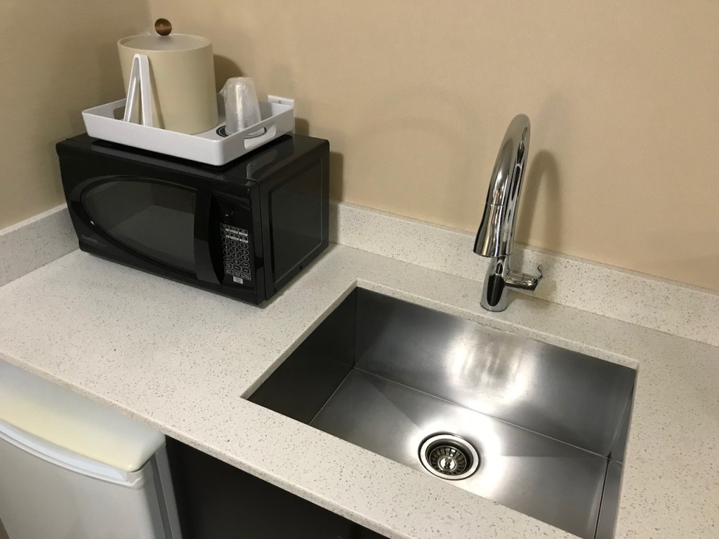There was a wet bar with a sink. This counter space contained a Danby half fridge, a Sunbeam coffee maker with unbranded coffee, along with a Danby Microwave. Two bottles of water were provided, which is always appreciated.