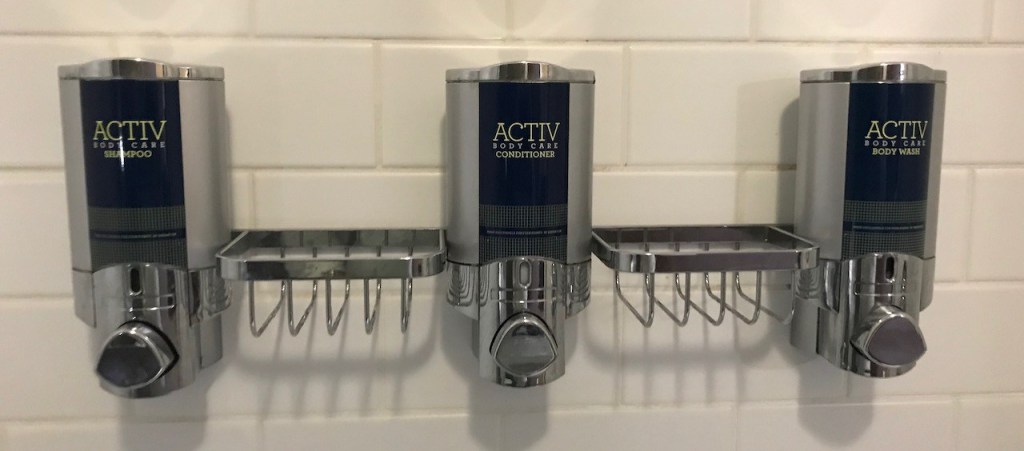 The room featured the usual Active – V toiletries in the in wall dispenser. I don’t mind these toiletries, but they are not super exciting in terms of “bathing excitement”. They are more functional than stylish suds.