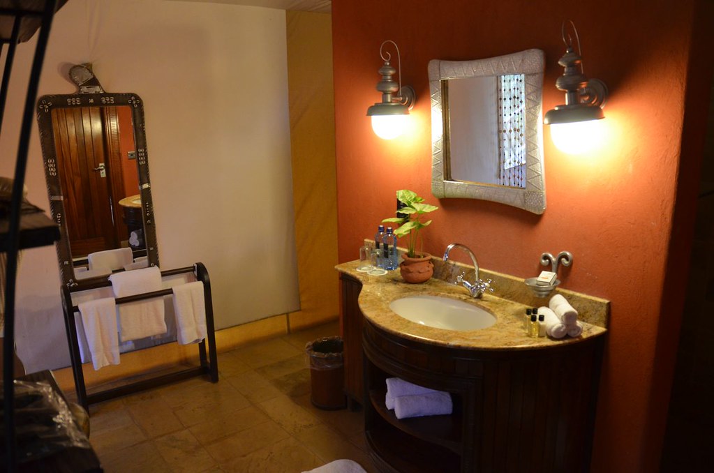 The tent’s back half of the room was the bathroom area. It was carefully divided into two zones; an indoor and outdoor zone. There was a small amenity table with mirror accompanied by Fairmont bathrobes. The bathroom was pretty spacious for a tent; much more spacious than any tent bathroom that I’ve been in.
