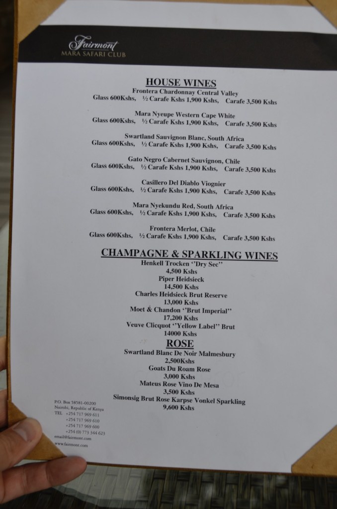 The food at the Fairmont Mara Club, like many other safari lodges, is offered in alignment with the game drive times. The lunches and dinners were a la carte ordering (not buffet styled) and involved the choices of a starter, soup, main and dessert. The food was of satisfactory quality – I wouldn’t expect the usual Fairmont flair or haute cuisine, but it was perfectly average given the environment where we were in. The food was nicely presented and always available.