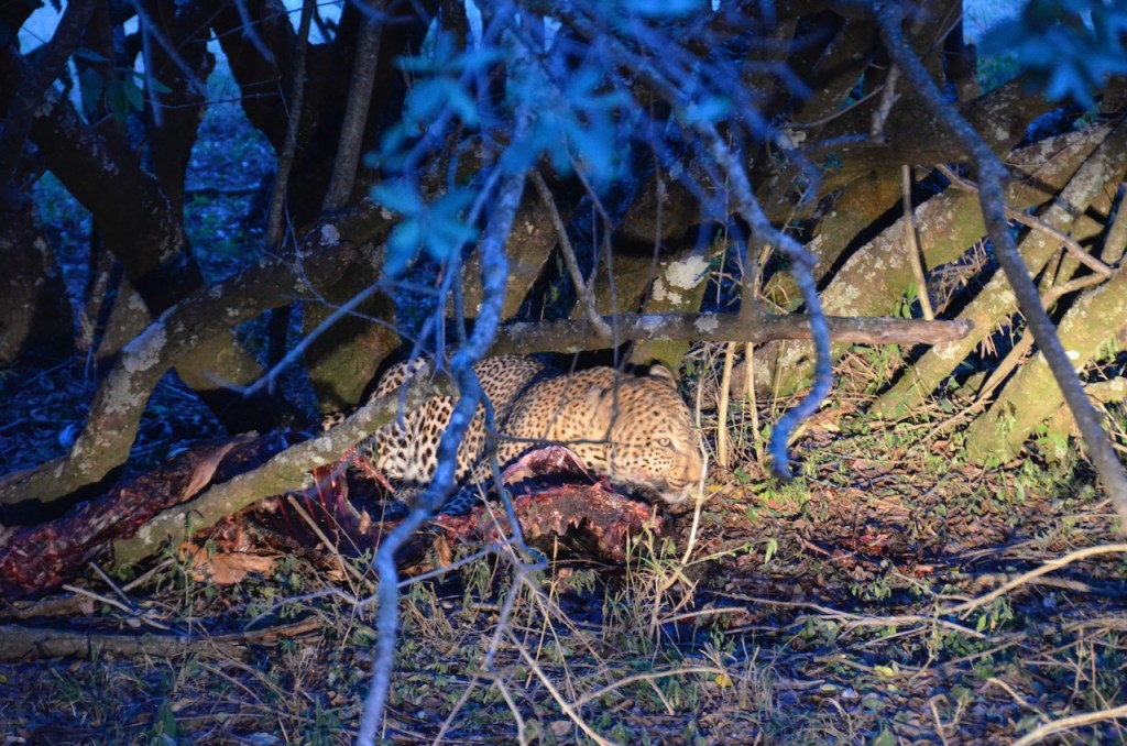The most interesting part of the safari was a leopard after a fresh kill. Spotted in the brush a mere 100 meters from the entrance to the resort, it was under a tree (light by the safari vehicle headlights here) chomping away on an animal. We actually got to hear the sounds of his teeth tearing and breaking apart the animals bones here with a cracking sound that I won’t soon forget. The leopard was complelely oblivious to the presence of the safari truck and was engrossed in his food.