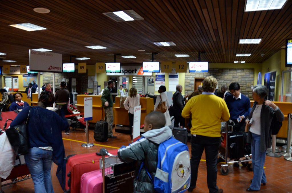 This time, we opted for a baggage wrap at $7 USD, considering the reputation of Nairobi and the poverty we had seen. The Swiss check in was open at T = 2 hours and 45 minutes. Swiss accepted our bags at the cramped business counter and was able to tag straight to Vancouver. We received our 3 boarding cards ex-Nairobi – Zurich – London – Vancouver and “apologies as we do not have a lounge to offer you”.