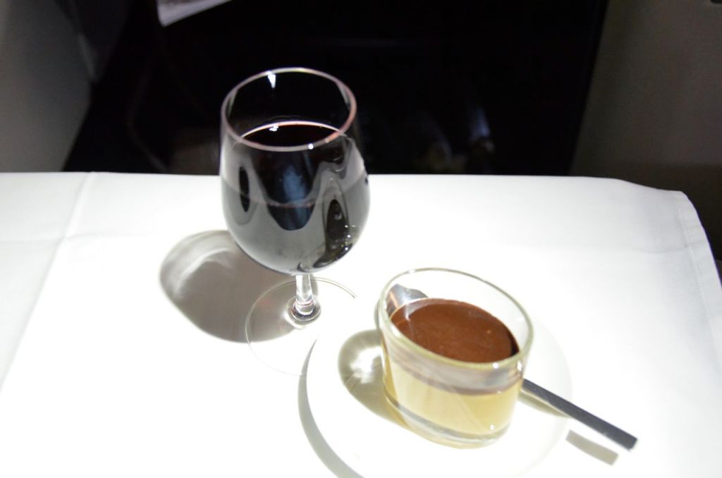 The regular dinner service started around 1:10 AM local time. There was a choice of a heavier beef tenderloin or a regional Alper macaroni and cheese. I say regional as it was specific to a region of Switzerland. I opted for the lighter Alper Mac and Cheese, paired with Domaine de Chauviny Beavaix 2012 from Switzerland.