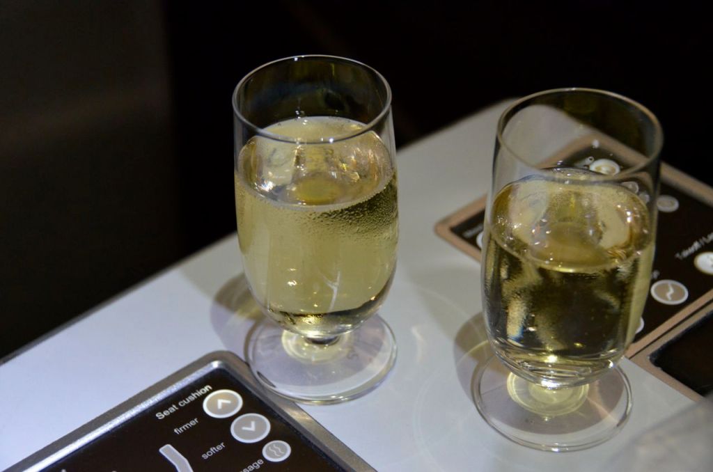 A pre departure beverage of champagne or orange juice was brought around on a tray in thimble glasses.
