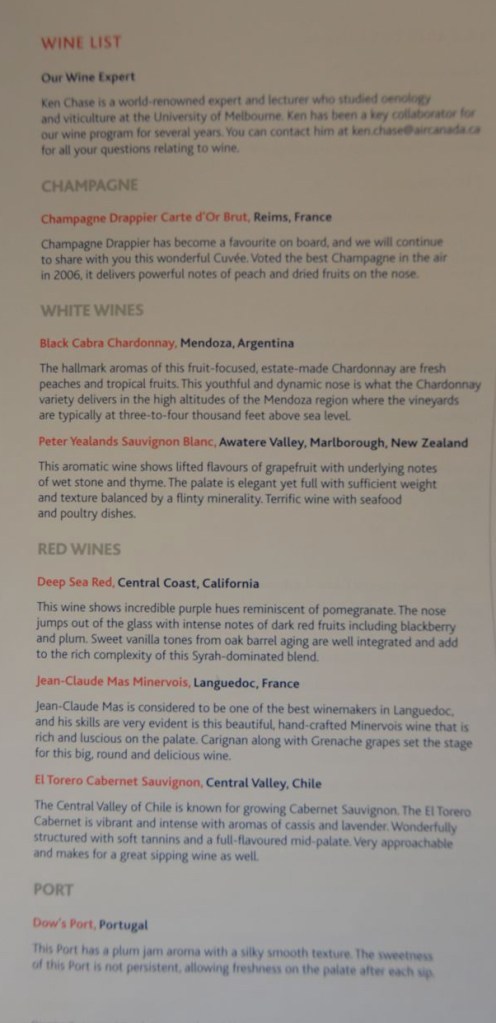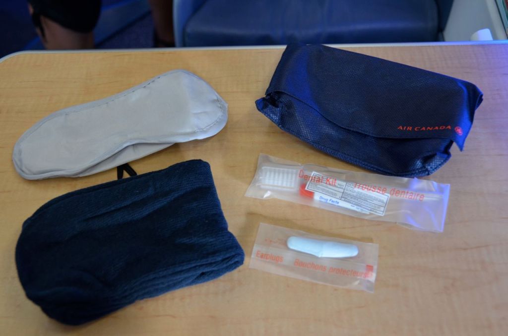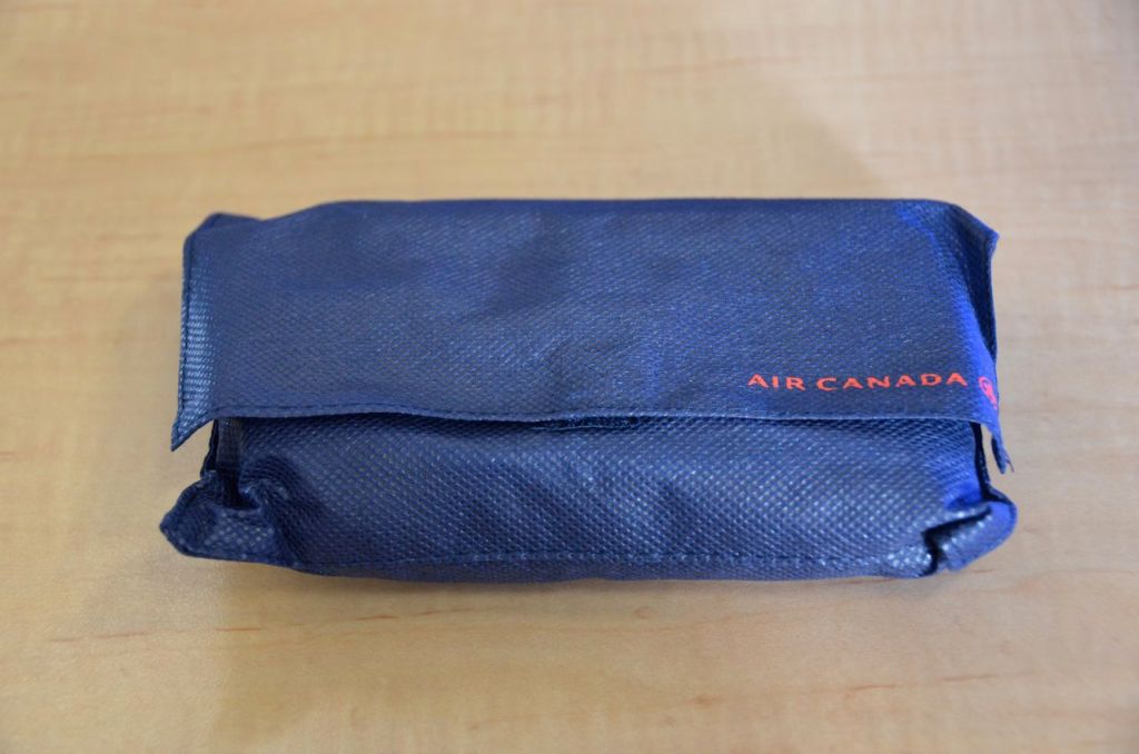 An amenity kit was waiting on the seat, along with a bottle of water. I’ve traveled Air Canada long haul business on upgrades, reward tickets, and contingent standby on staff fares for years now and the amenity kit seems to be getting cheaper and cheaper as the years go on. This particular amenity kit was so frail that it is really a single use container, with a tooth brush, socks and eye shades. The lip balm was conspicuously absent. It was by far the worst amenity kit out of the business class travels we had on this particular trip. Either Air Canada is far ahead of the curve and has figured out that business travelers don’t care, or they are so far behind and are hoping people don’t notice.