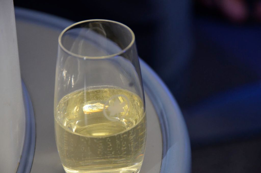 A Pre-Departure Beverage of Champagne or Orange Juice served from a tray offered in a larger thimble glass. There was also a selection of Canadian and British Newspapers that were also offered.
