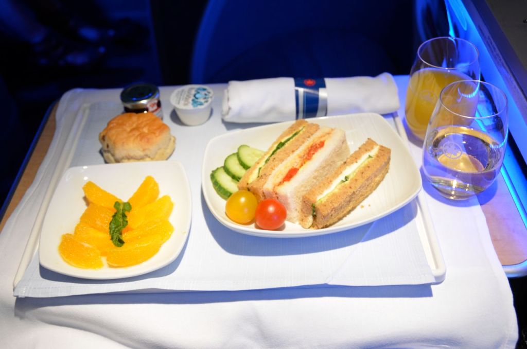 A “pre-arrival light meal” consisting of a very British Sandwich selection of cucumber with cream cheese, barbequed chicken with roasted pepper, and egg salad wit spinach. They all tasted mostly the same.