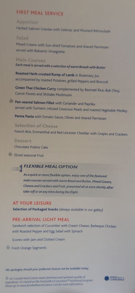 The menus were presented while on the ground at Heathrow. I was really happy to see something other than beef tenderloin with green beans, which has marked the menu for years.
