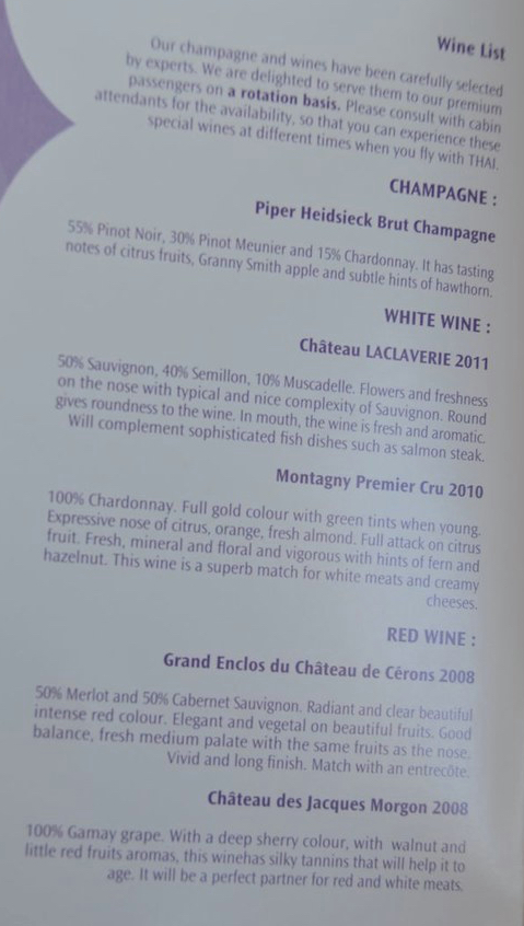 This was followed shortly with a pre-supper drink off the cart. I went with Piper Heidsieck champagne again, which was served along with some almonds. Thai Airways flight attendants have an separate attire for in flight versus the on ground outfit. The Thai Flight Attendants had changed into their in flight attire as they started service.