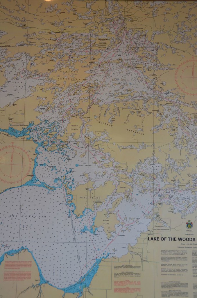 Kenora is a unique place to visit. The lake is “North America’s Premium Boating destination” and surrounds 14,522 islands. Most of the town is surrounded around the lake and it’s features. Many of the islands are Crown land, although I did see Sotheby’s Real Estate marketing a few private islands for around $2.5 million. In some ways, it reminded me of a forested version of the Maldives without the sandy beaches. Here’s a blow up photograph from the map of the Best Western. Kenora is located in the top center of the map.