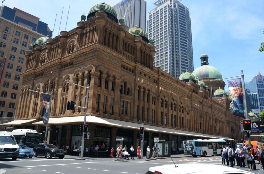 The Queen Victoria Building is surrounded by modern era towers making for a striking contrast between old and new.