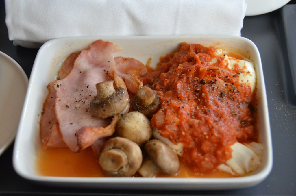 A Full Breakfast was offered on today’s flight. The selection was a choice of Muesli with Milk (in a bottle) or Eggs with Bacon, Mushrooms and a tomato ragout. I didn’t have a strong appetite given the early morning departure, but I thought that I’d better eat since you can’t turn down food when you travel.