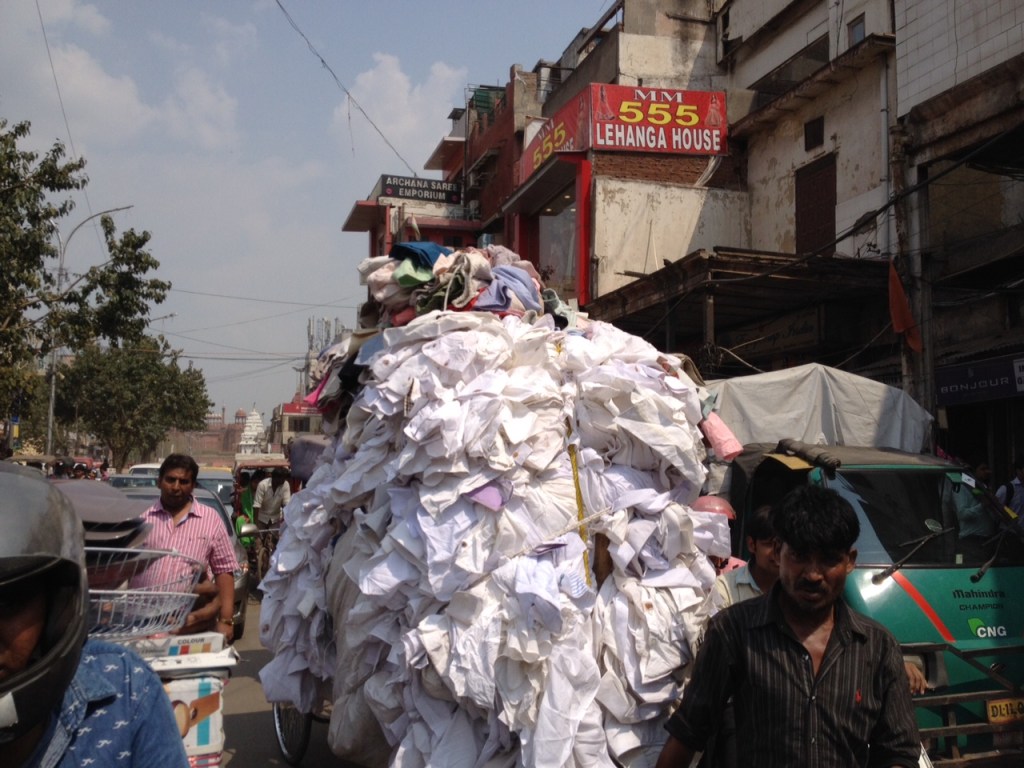 Our ride led us through old Markets, tiny alleyway streets, through various smells and fabrics areas. The work conditions for this poor driver were dreadful; peddling our 350 lbs combined weight around smog and carbon dioxide filled streets that were stop and go and completely clogged with traffic of all kinds. I paid the negotiated rate of 500 Rupees ($8 USD) including a tip and our driver was super satisfied.