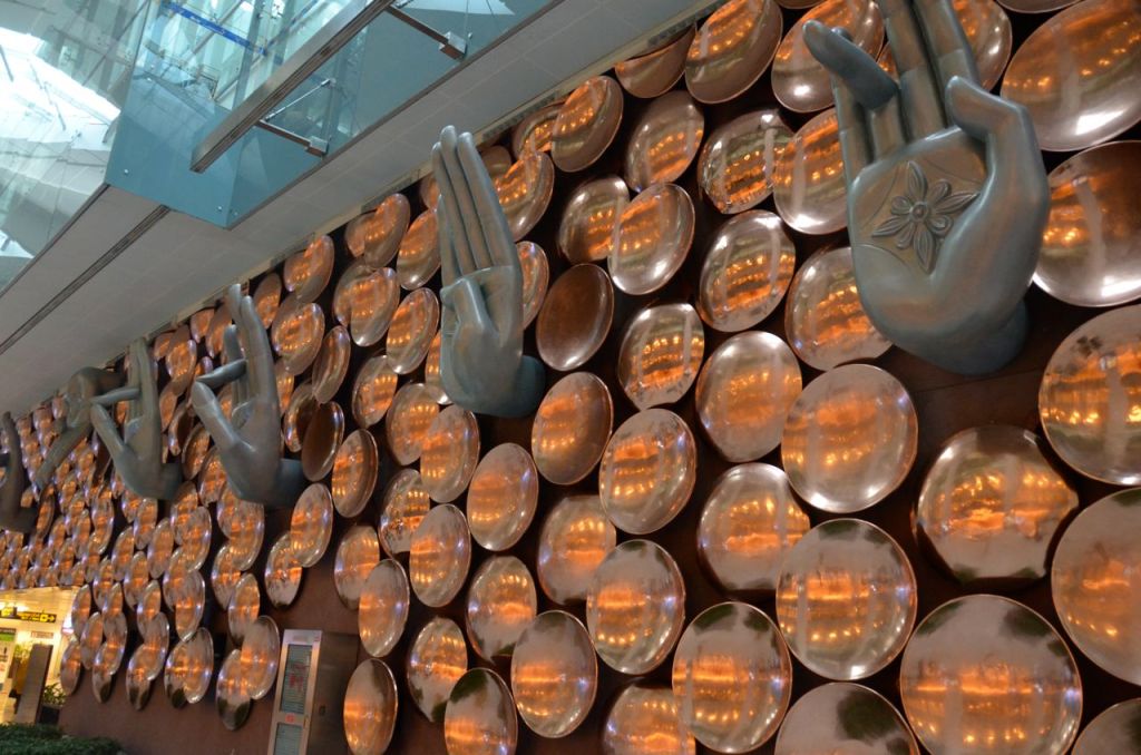 We had a round about descent into Delhi. We landed and started walking down the long terminal of Indira Gandhi International Airport. We ended up at the other end of the international arrivals hall and passed the mudras from the opposite angle. We bypassed international customs thanks to the domestic lanes and the “D” on our boarding card.