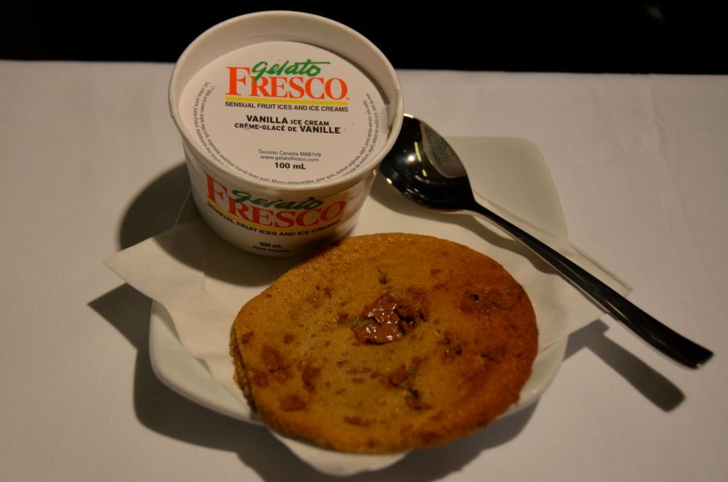 I went with the usual ice cream for dessert and a cookie that has been a feature on Air Canada for years. It featured a dark chocolate cookie baked fresh on board, along with Gelato Fresco Ice Cream. The cookie was terrific, although a little crumbly with the opportunity to drip a bit of chocolate onto your pants as you enjoyed it.