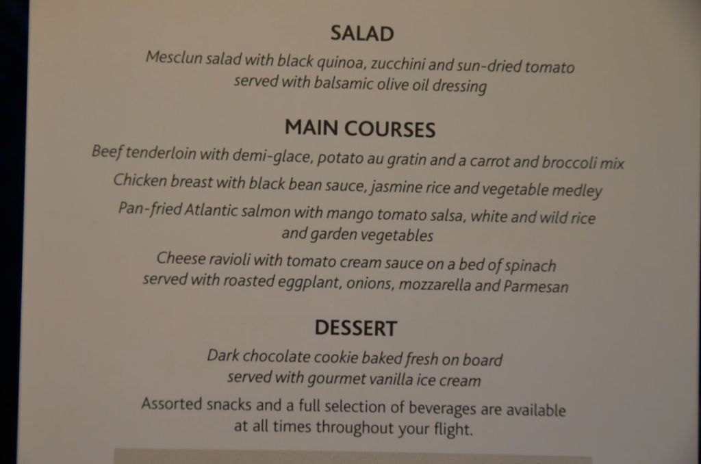 While we were on the ground, a printed dinner menu was handed out which is a nice touch. Unfortunately, the menu hasn’t changed in about 10 years. Air Canada hasn’t yet found celebrity chefs, themed dining months, or typically Canadiana dishes served here. This can be considered a plus or a minus. In this case, it was a plus since we’d been eating curry for the past week and a half and it was nice to have a slight change of pace.