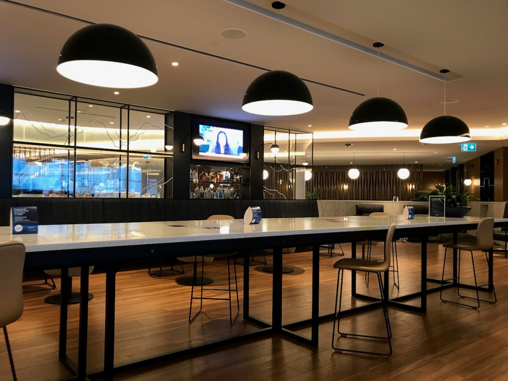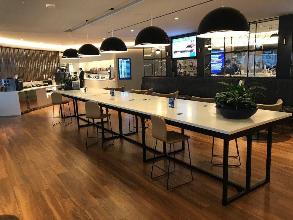 The lounge offered a substantial food and beverage space in an area centred around a long table. The space was contemporary and sleek.