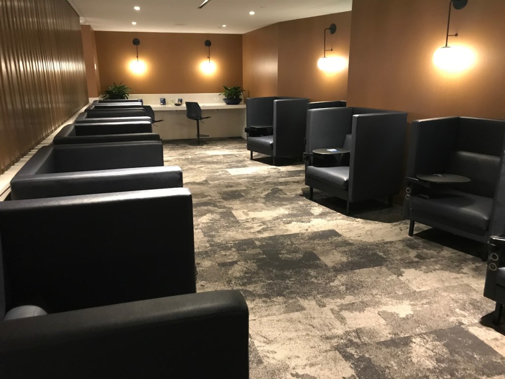 Moving further into the back of the lounge, there were further private lounge chairs with privacy dividers similar to the seats found in American Express Centurion Lounges or a Delta Sky Club. These seats, being at the back of the lounge, were quite dark, given the absence of windows in the back area of the lounge. This portion was completely deserted on my visit.