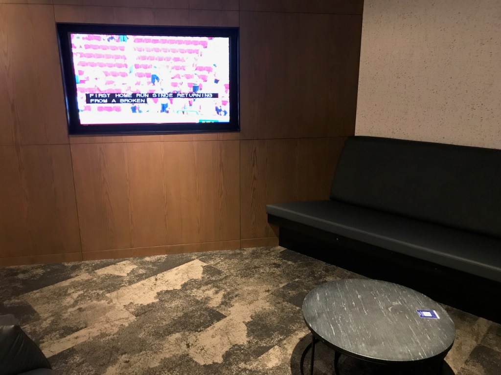 The lounge extended into the back of the building. There were a few additional features of the lounge. The first one that I came to was a small media room. The media room offered a television and seating for approximately 4-7 people on benches surrounding the television.