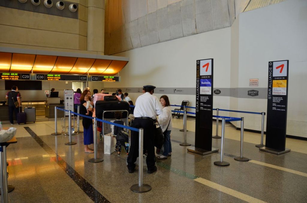After returning the rental car, we headed for the Tom Bradley International Terminal to check in for our Asiana Business Class Los Angeles – Incheon flight. The terminal is the flagship of Los Angeles airport terminals, and it is a wide and imposing structure.