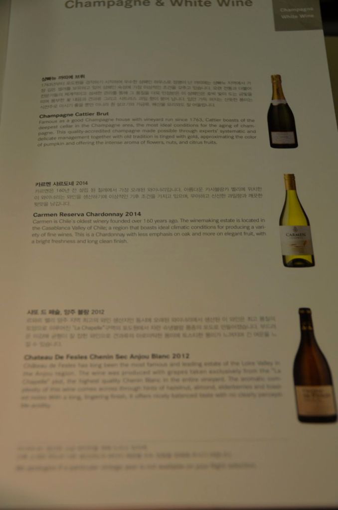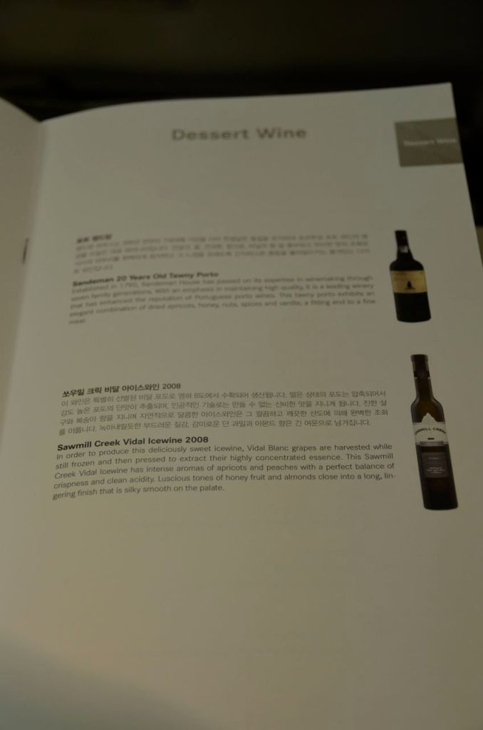 A decent wine list for the Asiana Airlines medium haul flight. They offered one champagne, two whites, three reds and a port and ice wine offering.