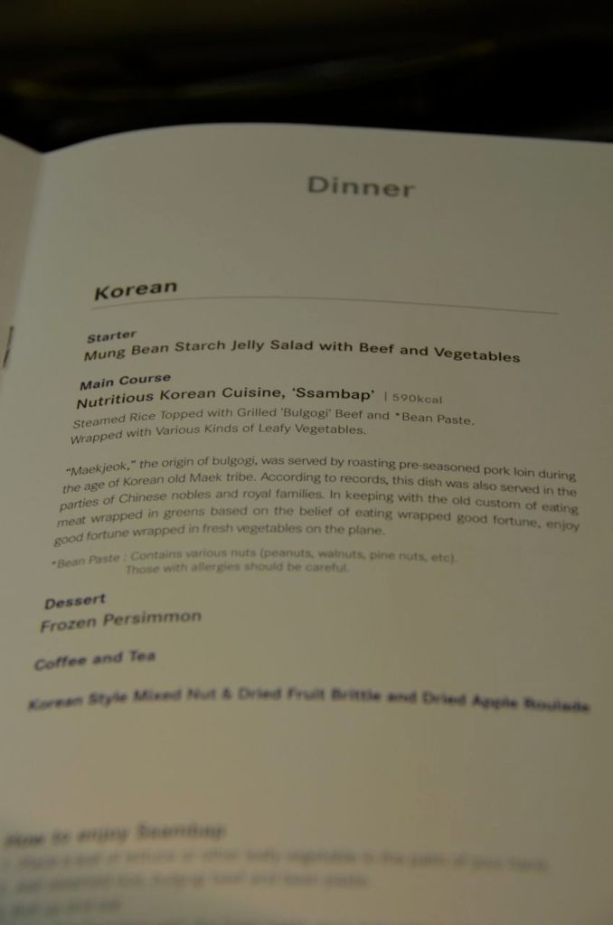While we were on the ground, the dinner menus were distributed. As with other medium haul Asiana Airlines flights, no amenity kits were offered. However, in the truest asian traditions, slippers were provided.