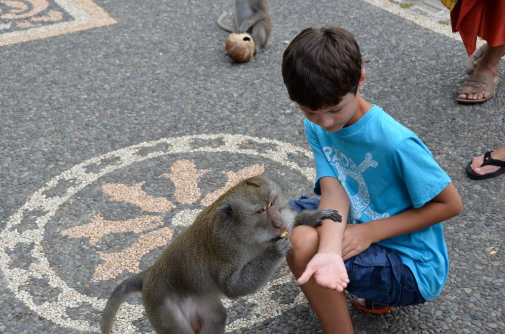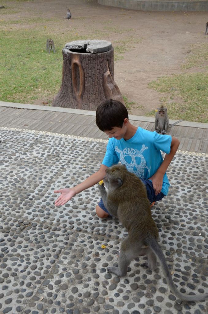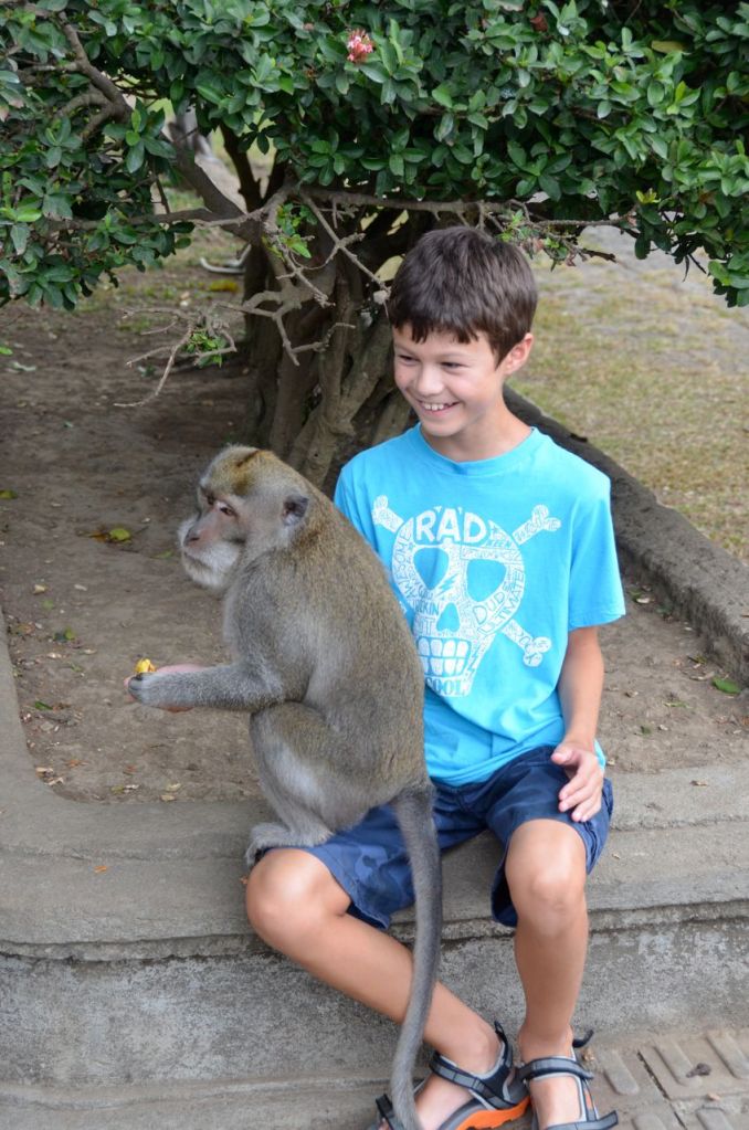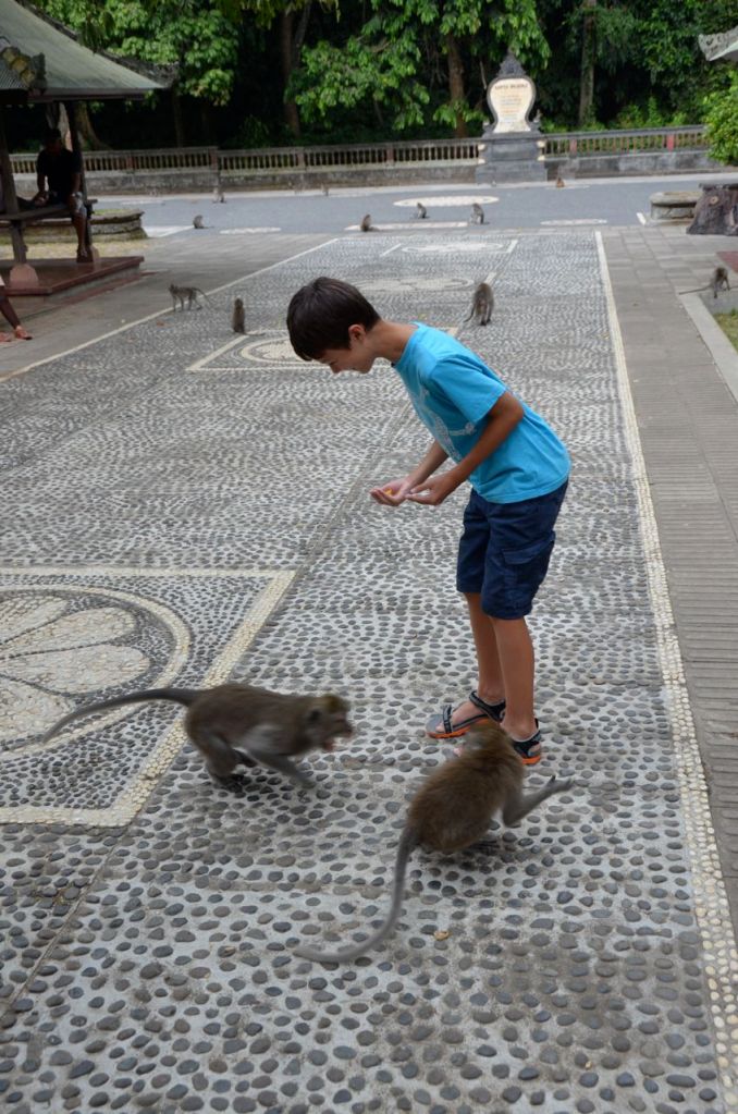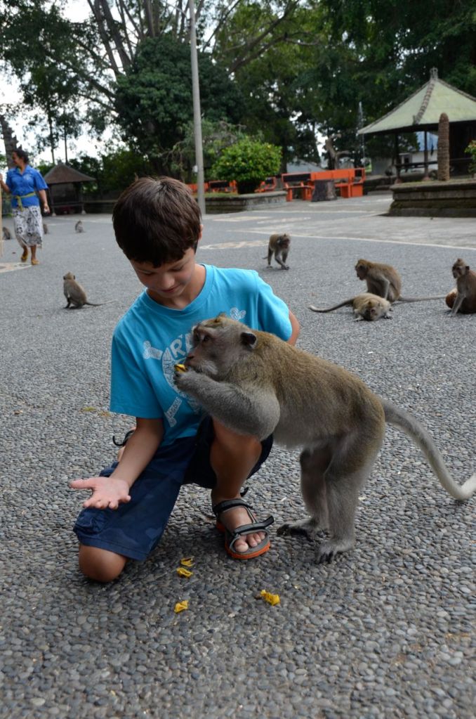 We left the plantation and headed over to the Monkey Forest. Our tour guides ended up bypassing the Sacred Monkey Forest at Ubud and headed over to another version at Taman Ayun. I was initially a little disappointed to be going to the second rate attraction, but it actually worked out a little better. The monkeys at the place that we visited were far less aggressive than on my last visit to the Sacred Monkey Forest in Ubud. I was able to walk through Taman Ayun without having monkey’s attack my pockets nor rip sunglasses or hats off my head. I think this probably meant a better experience for my son as he was able to have monkeys crawl all over him as he fed them, instead of the aggressive rip and run that I experienced the last time we visited Ubud. Last time I visited, I had monkey’s attack me for a bottle of water that I was carrying and on another occasion, some hand crafted soap that I had purchased earlier that I was carrying in my cargo shorts.