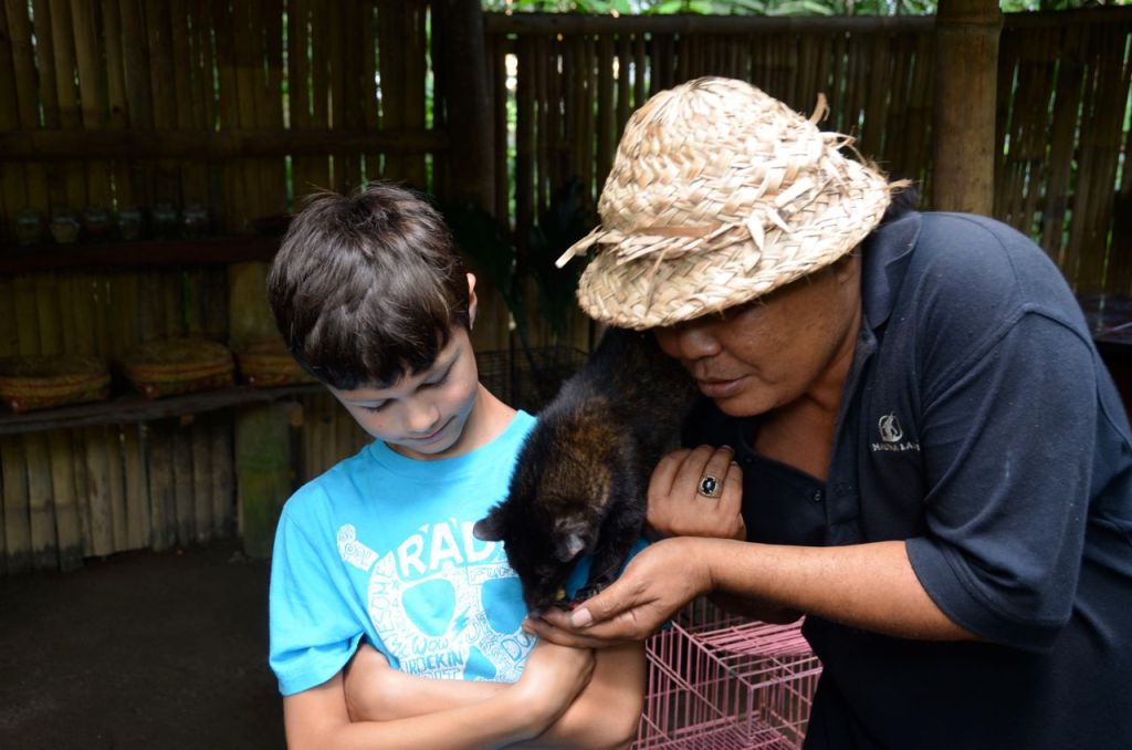 We then headed (or were directed) over to a plantation just outside of Ubud where they processed Kopi Luwak. For those that aren’t familiar with it, it’s coffee beans that are eaten by a civet monkey, passed through the gastrointestinal system of the civet, then roasted for a unique taste. I’ve tried it before and couldn’t really tell it apart given a “Pepsi Challenge” taste test. WT73Jr got the opportunity to get up close to one of these civets who were actually quite tame. It was a typical commercial operation – sample these 16 varietal cups of tea and coffee and you can purchase them at outrageous prices ($16+ USD for less than 1 lb of coffee). I had purchased some Bali Gold coffee in the supermarket in Nusa Dua for about 7$ a lb. Thankfully, we didn’t look the part of impulse shoppers similar to many Chinese tourists that may pass through the area. We ended up leaving without buying anything.