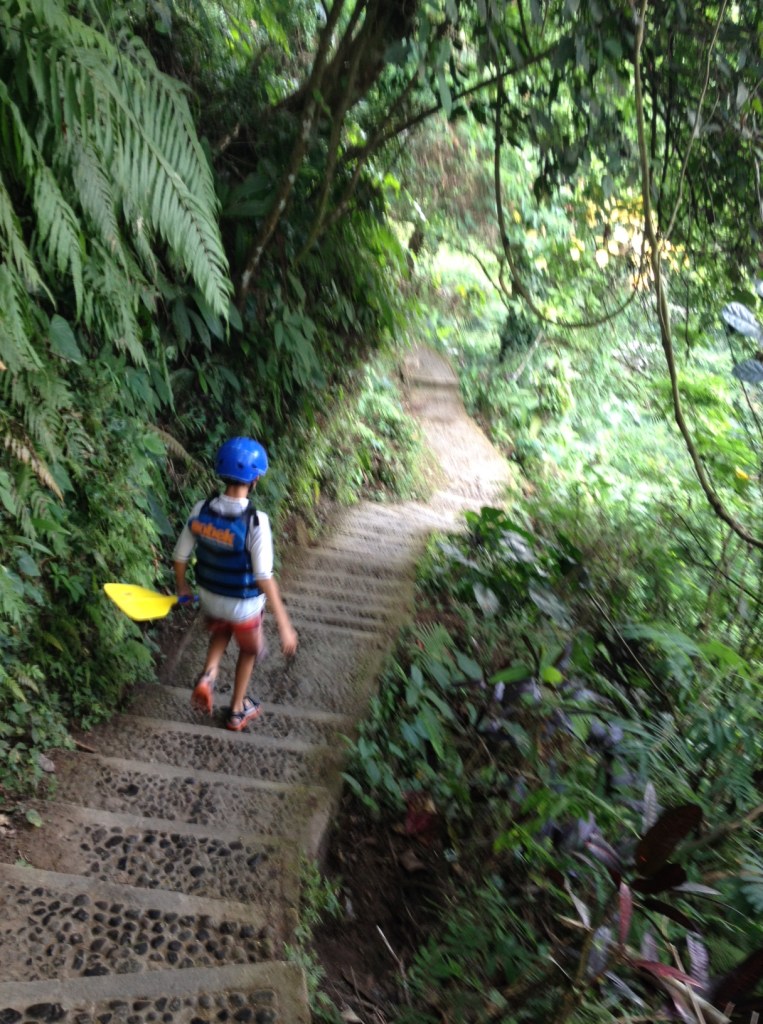 On arrival to the rafting operator, we got suited up in our gear. The rafting operation was run by Sobek’s, and they were quite competent. They happened to allow cameras on the tour in a wet bag, so I packed my iPhone. I didn’t get to take any action shots, since it was in the wet bag during the rafting. My son was so into it, he pretty much disappeared down the stairs with his paddle at the word “go” when it was time to go to the put in. Our walk down to the put in was through a beautiful tropical forest.