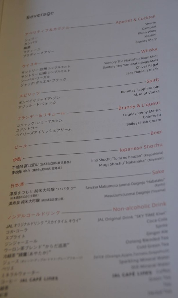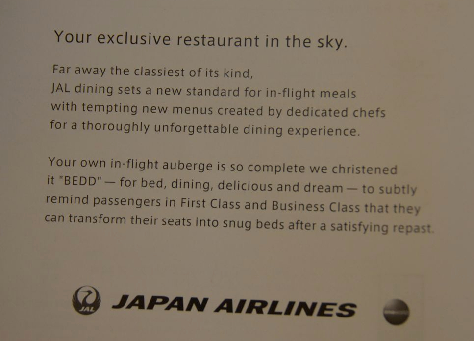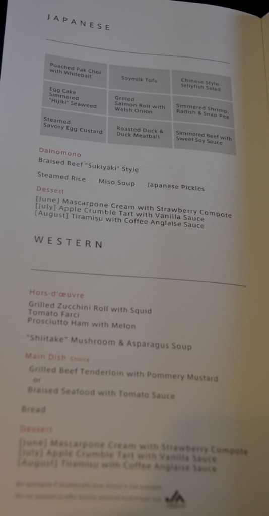 The lunch menus were passed out at altitude, followed by a quick order taking for lunch services. The menus were themed with BEDD Sky Auberge by JAL markings. The BEDD acronym stands for bed, dining, delicious and dream. It is a JAL promotion to remind travellers that they are welcomed to tuck into sleep after their satisfying meal. I find it a bit of a strange reminder as sleep is the last thing I want to be reminded to be thinking about when I pick up a menu. The two don’t personally have a great association for me.